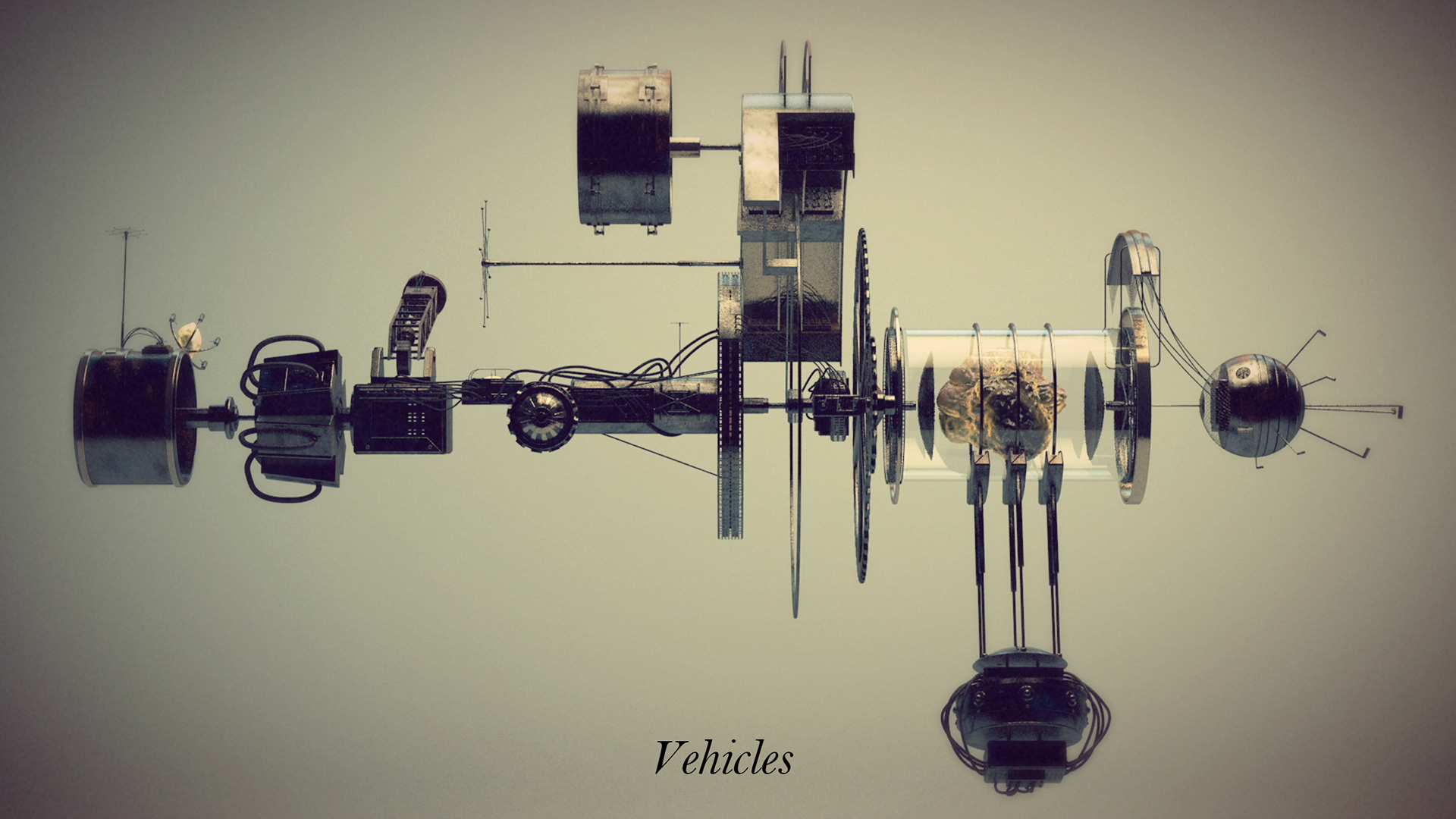 Vehicles is video and sound work. An imagined structure is revealed from its smallest components to the larger and more complex entities they compose. The accompanying music and sound reinforce a narrative ranging from a place of intimacy to a growing vastness, while echoing the visual content of the video. This work is loosely inspired from the essay Vehicles written by Italian-Austrian cyberneticist Valentino Braitenberg.